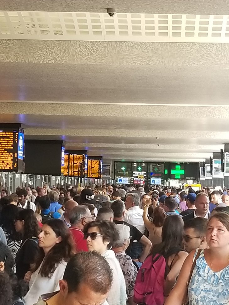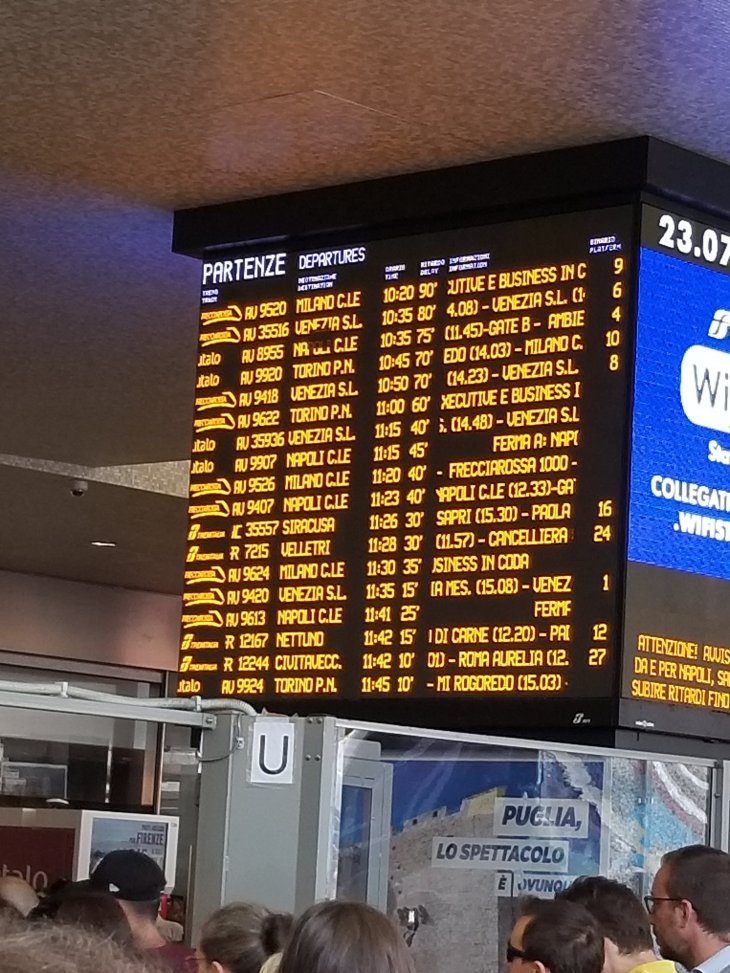 When we got to the main train station, we found a huge crowd of people trains had been delayed up to ninety minutes, and our train (which was supposed to leave within half an hour) wasn’t listed. Turns out that the Italian train is on strike.